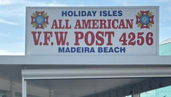 Veterans of Foreign Wars Post 4256 12901 Gulf Blvd Madeira Beach, FL 33708At John’s Pass Due to severe damage from Hurricanes Helene and Milton, VFW Post 4256 is closed until repairs can be made. Parking is prohibited to all except authorized construction crew. All Unauthorized Vehicles parked at VFW Post 4256 will be towed at owner's expense. Donations may be sent to the address above. The post phone number is currently out of service, we are working to get a cell phone, in the interim if you have any questions, please feel free to call or text me directly at 210-324-1775. I will do my best to respond ASAP. Thank you for your service and support, we miss all of you,,,,the men and women of VFW Post 4256. David Cain Commander, VFW Post 4256 Website Updated Dec 14, 2024 |
